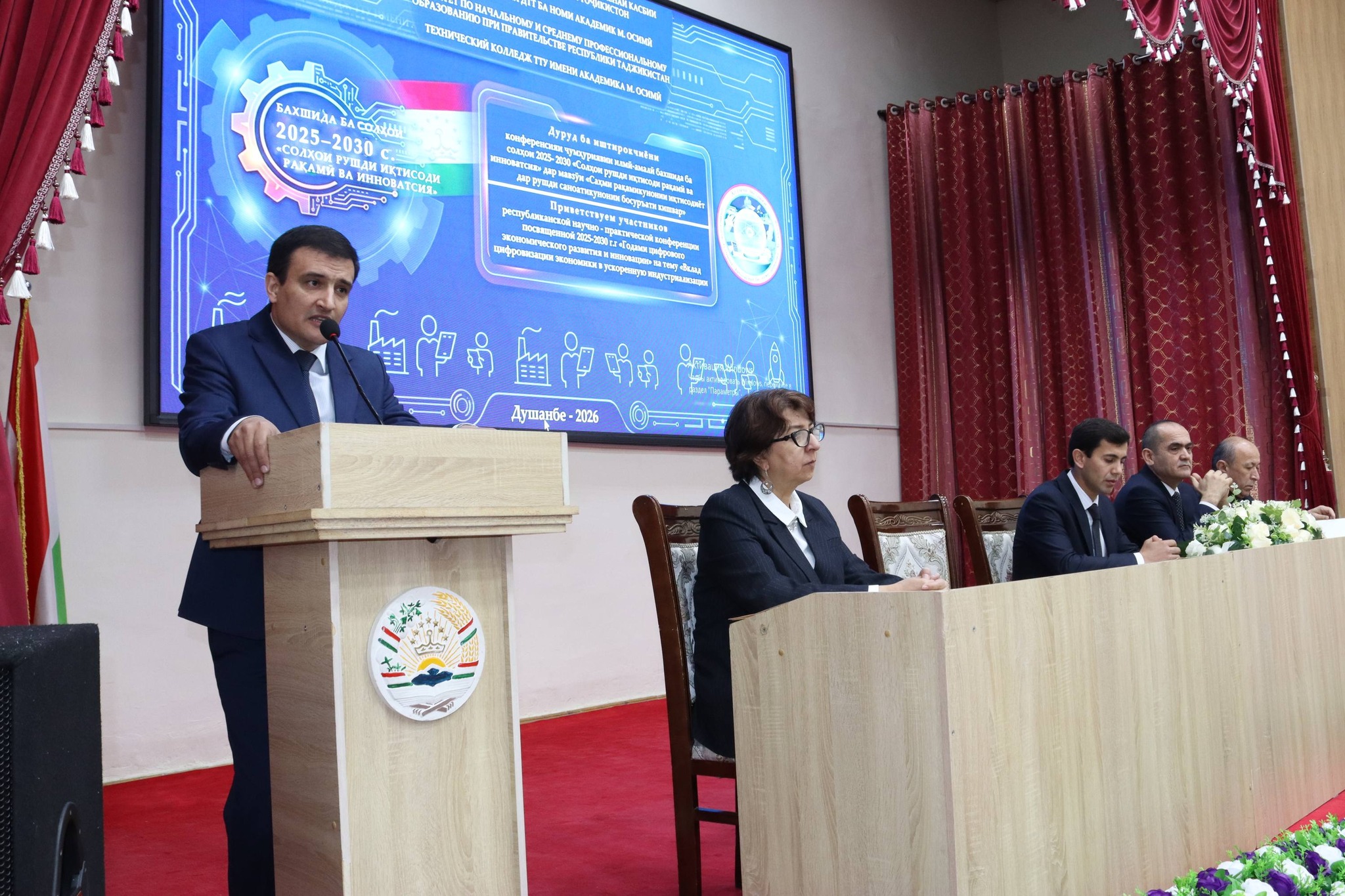 In his welcoming speech, the Deputy Director for Academic Affairs Rahmonali Odinaev greeted the guests and participants and officially opened the conference. He noted that the Founder of Peace and National Unity – Leader of the Nation, President of the Republic of Tajikistan, Honorable Emomali Rahmon, in his Address to the Parliament on December 28, 2024, emphasized the importance of expanding innovation processes and fully utilizing the opportunities of digital technologies in the economy. Therefore, the years 2025–2030 in Tajikistan were declared the Years of Digital Economy and Innovation Development.